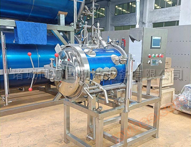 一般罐头食品厂对罐头作常压水煮加热杀菌处理时都采用本形式的卧式杀菌锅,本设备通过引入压缩空气可实现反压杀菌。如冷却需在锅内进行,须用水泵打入锅顶部的喷水管(或采用水循环系统)。在杀菌时,由于加热使罐头温度升高,罐头内压力会超过罐外(在锅内)的压力。因此,为了避免杀菌时玻璃瓶罐内增压而跳盖,对马口铁罐两端面凸出,必须施加反压力,特别是对需要较高杀菌温度的肉类罐头更就如此。